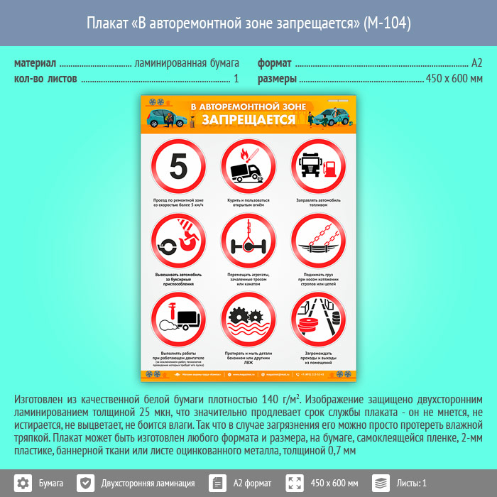 Плакат «В авторемонтной зоне запрещается» (М-104, ламинированная бумага, А2, 1 лист) в Омске купить
