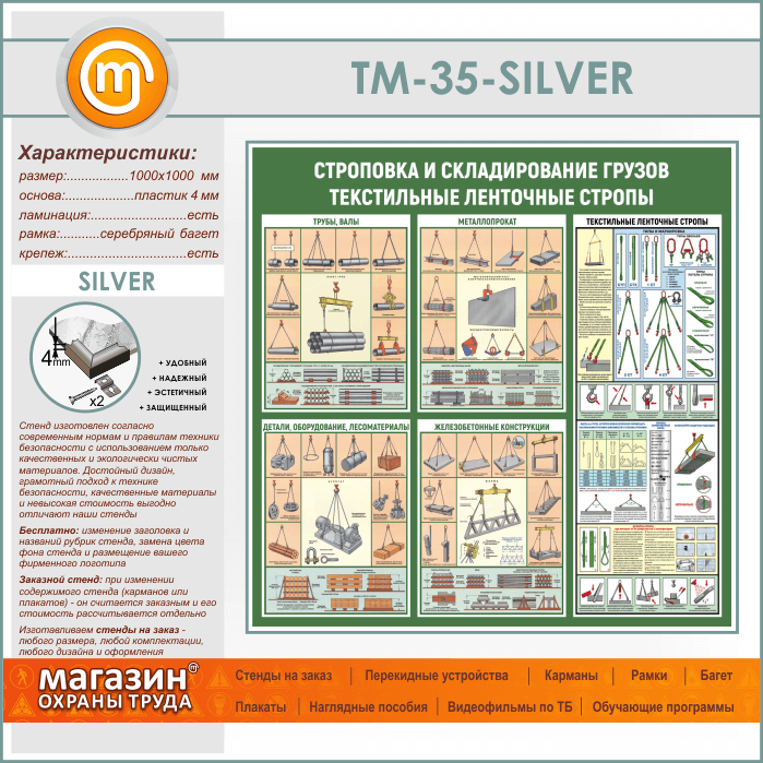 Стенд «Строповка и складирование грузов. Текстильные ленточные стропы» (TM-35-SILVER) в Омске купить