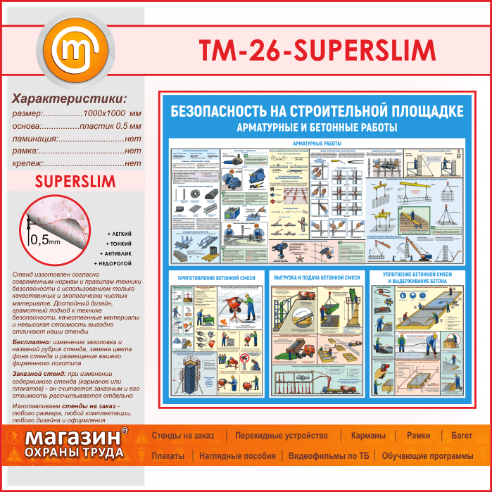 Стенд «Безопасность на строительной площадке. Арматурные и бетонные работы» (TM-26-SUPERSLIM) в Омске купить