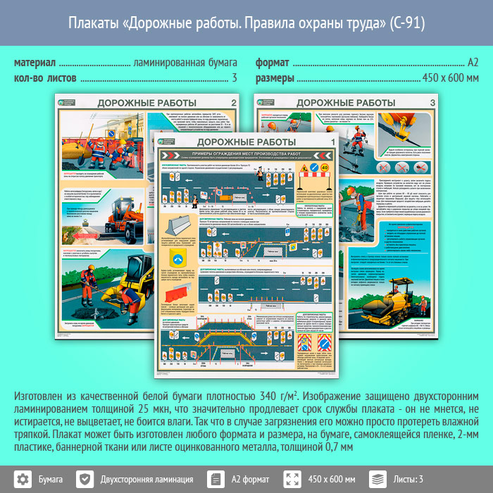 Плакаты «Дорожные работы. Правила охраны труда» (С-91, ламинированная бумага, А2, 3 листа) в Омске купить