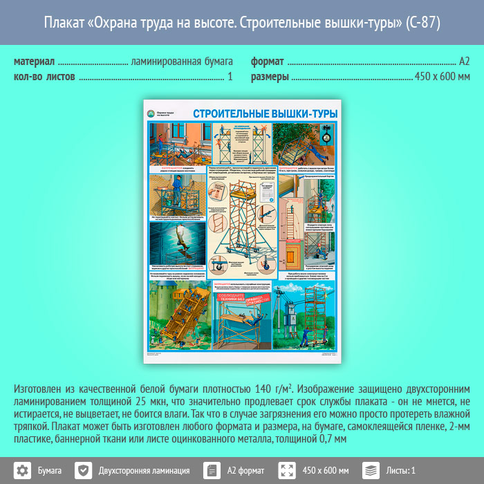 Плакат «Охрана труда на высоте. Строительные вышки-туры» (С-87, ламинированная бумага, А2, 1 лист) в Омске купить
