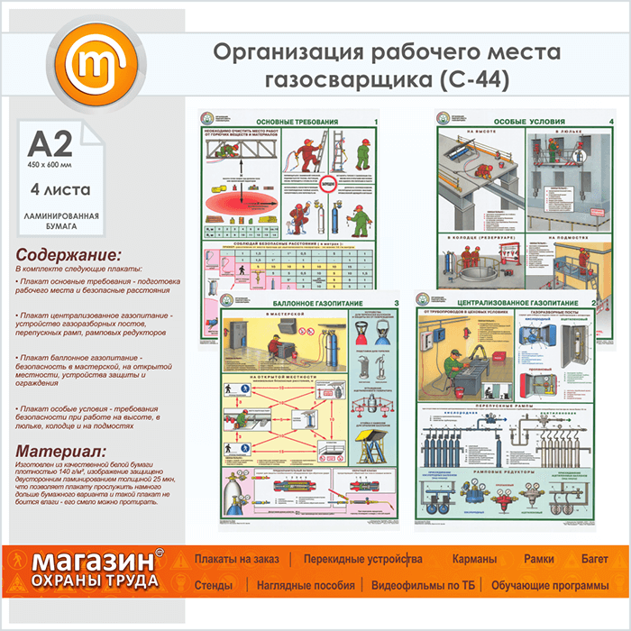 Плакаты «Организация рабочего места газосварщика» (С-44, ламинированная бумага, А2, 4 листа) в Омске купить
