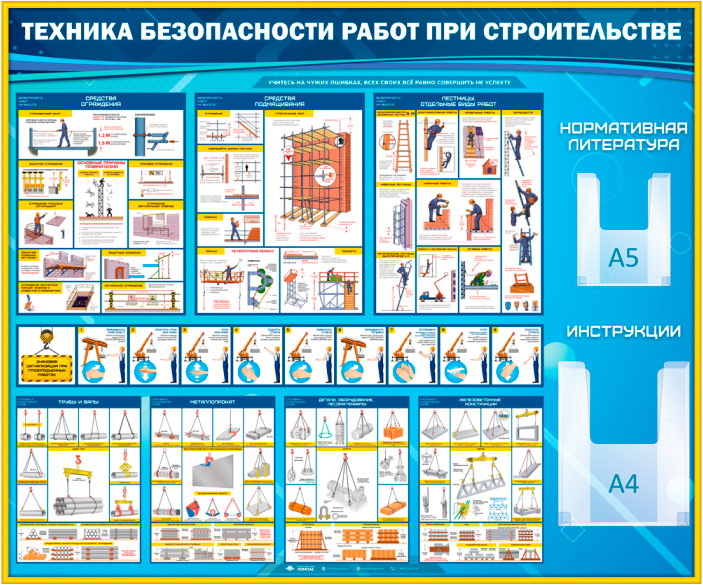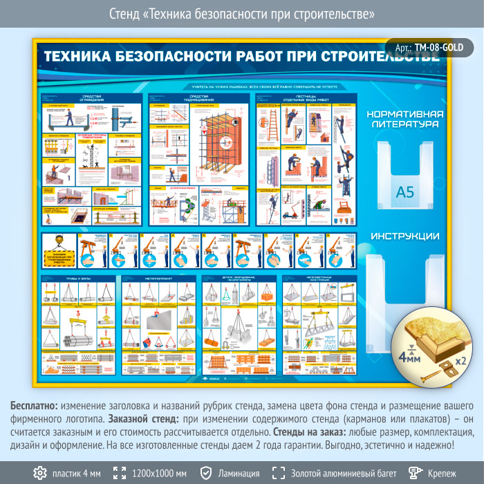 Стенд «Техника безопасности при строительстве» с 2 объемными карманами (TM-08-GOLD) в Омске купить