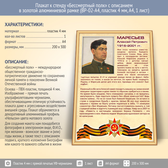 Плакат к стенду «Бессмертный полк» с описанием в золотой (матовой) алюминиевой рамке (BP-02-A4, пластик 4 мм, А4, 1 лист) в Омске купить