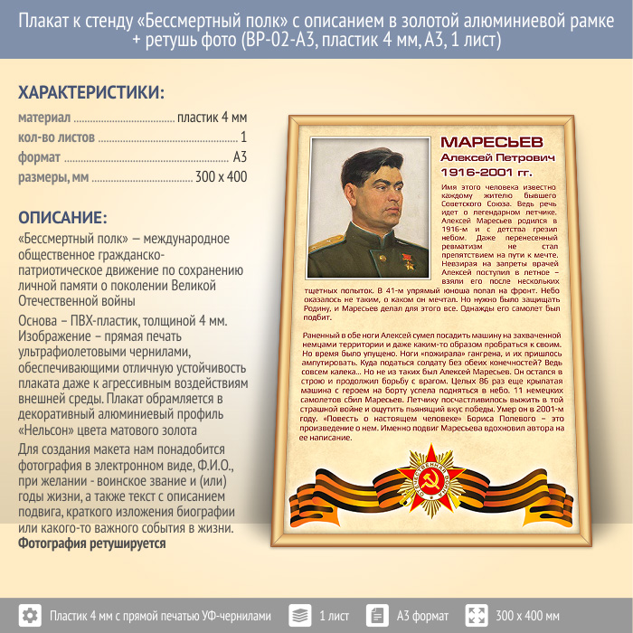 Плакат к стенду «Бессмертный полк» с описанием в золотой (матовой) алюминиевой рамке + ретушь фото (BP-02-A3, пластик 4 мм, А3, 1 лист) в Омске купить
