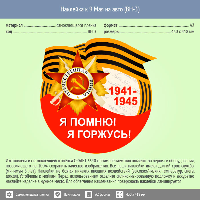 Наклейка к 9 Мая на авто А2 формата (BH-3) в Омске купить