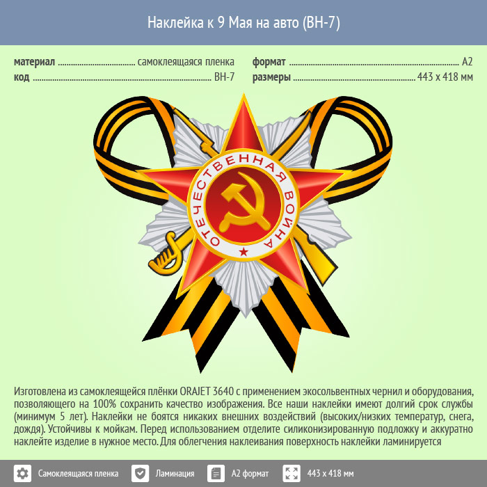 Наклейка к 9 Мая на авто А2 формата (BH-7) в Омске купить