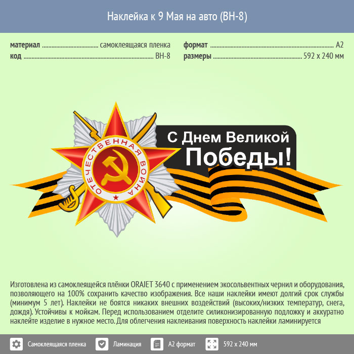 Наклейка к 9 Мая на авто А2 формата (BH-8) в Омске купить
