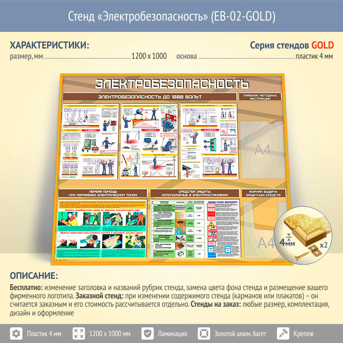 Стенд «Электробезопасность до 1000 вольт» с плоским и объемным карманами (EB-02-GOLD) в Омске купить