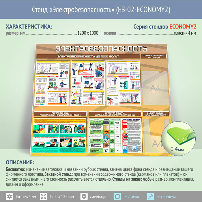 Стенд «Электробезопасность до 1000 вольт» с плоским и объемным карманами (EB-02-ECONOMY2) в Омске купить