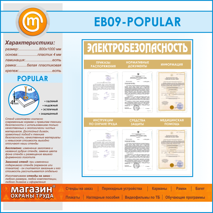 Стенд «Электробезопасность» с 6 карманами (EB-09-POPULAR) в Омске купить