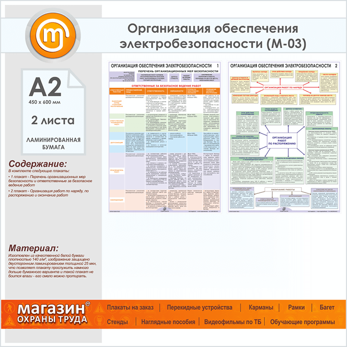 Плакаты «Организация обеспечения электробезопасности» (М-03, ламинированная бумага, А2, 2 листа) в Омске купить