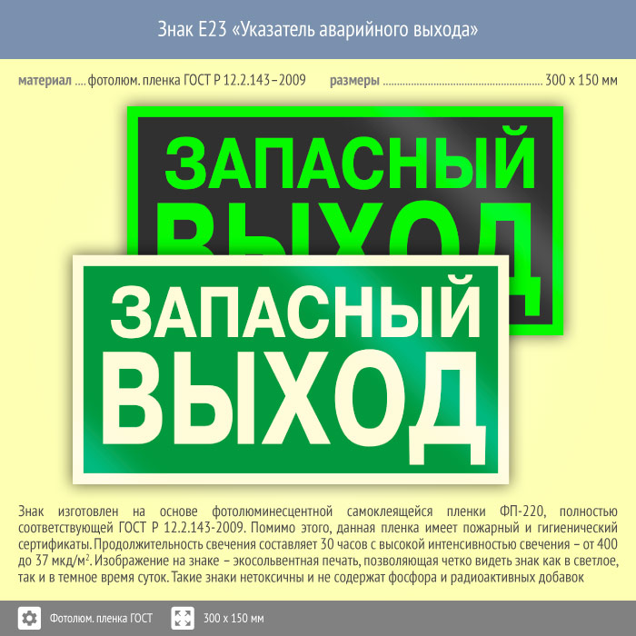Знак E23 «Указатель запасного выхода» (устаревший) (фотолюминесцентная пленка ГОСТ 34428-2018, 300х150 мм) в Омске купить