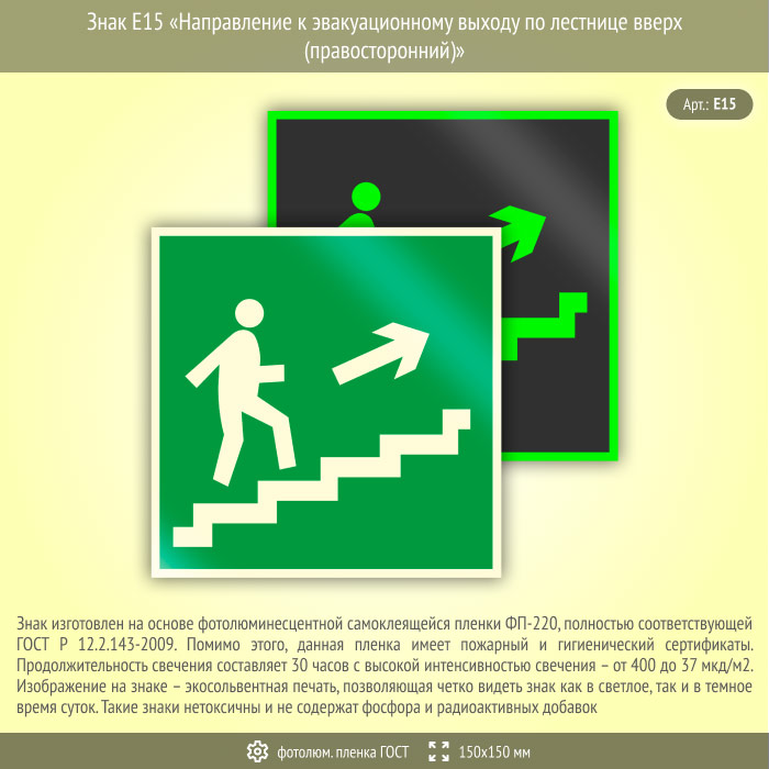 Знак E15 «Направление к эвакуационному выходу по лестнице вверх (правосторонний)» (фотолюминесцентная пленка ГОСТ 34428-2018, 150х150 мм) в Омске купить