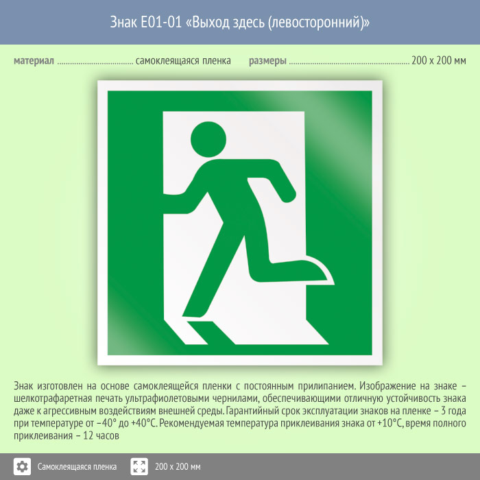 Знак E01-01 «Выход здесь (левосторонний)» (пленка, 200х200 мм) в Омске купить