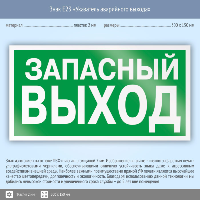 Знак E23 «Указатель запасного выхода» (устаревший) (пластик, 300х150 мм) в Омске купить