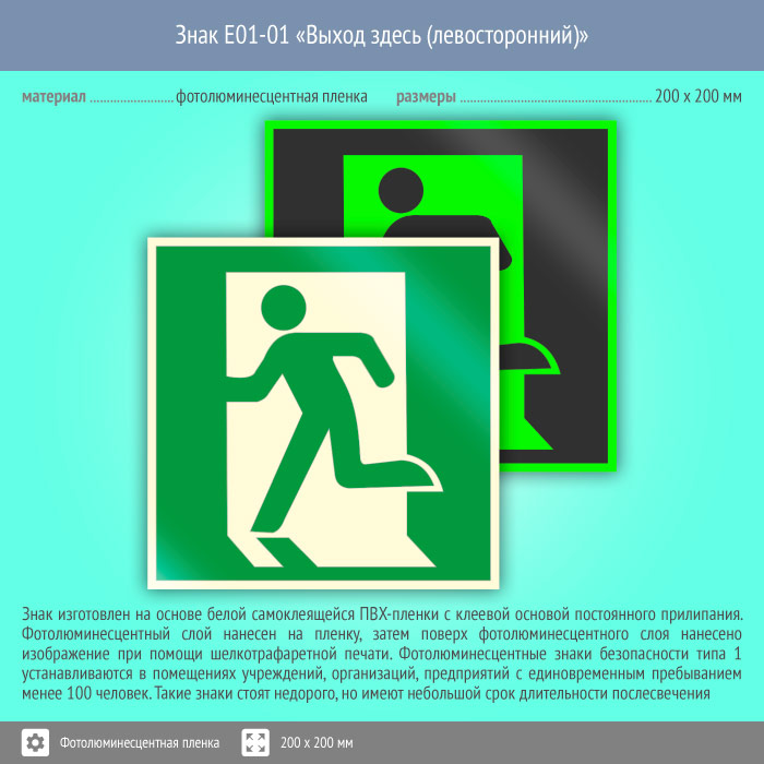 Знак E01-01 «Выход здесь (левосторонний)» (фотолюминесцентная пленка, 200х200 мм) в Омске купить