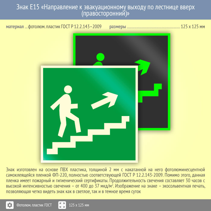 Знак E15 «Направление к эвакуационному выходу по лестнице вверх (правосторонний)» (фотолюминесцентный пластик ГОСТ 34428-2018, 125х125 мм) в Омске купить