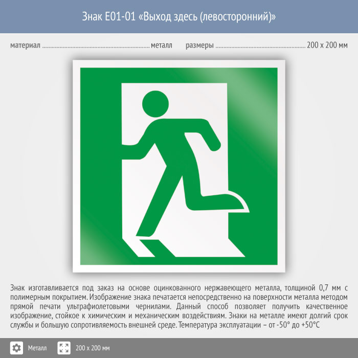 Знак E01-01 «Выход здесь (левосторонний)» (металл, 200х200 мм) в Омске купить