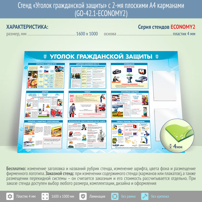 Стенд «Уголок гражданской защиты» с 2-мя плоскими А4 карманами (GO-42.1-ECONOMY2) в Омске купить
