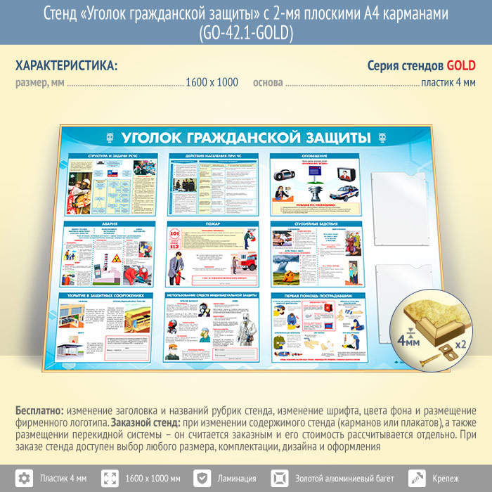 Стенд «Уголок гражданской защиты» с 2-мя плоскими А4 карманами (GO-42.1-GOLD) в Омске купить