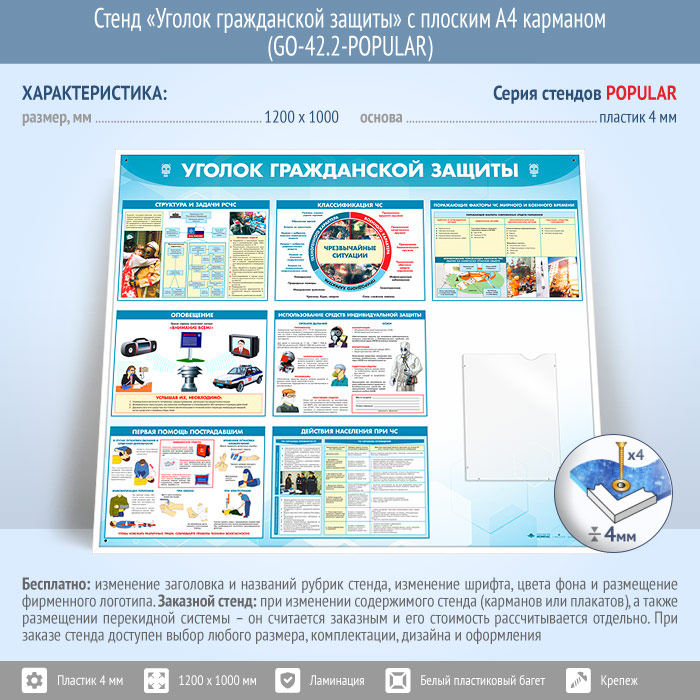 Стенд «Уголок гражданской защиты» с плоским А4 карманом (GO-42.2-POPULAR) в Омске купить
