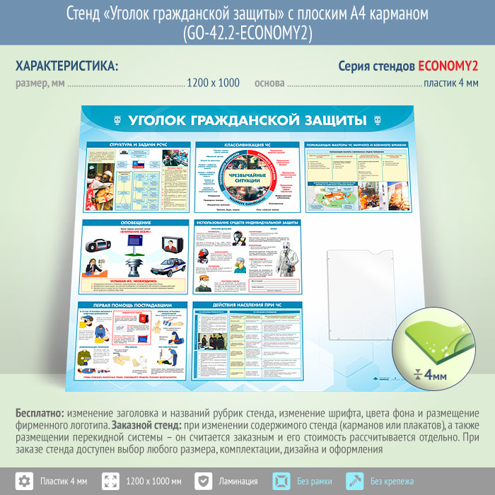 Стенд «Уголок гражданской защиты» с плоским А4 карманом (GO-42.2-ECONOMY2) в Омске купить