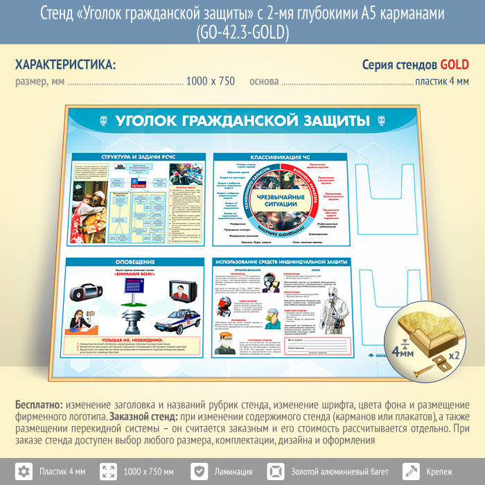 Стенд «Уголок гражданской защиты» с 2-мя глубокими А5 карманами (GO-42.3-GOLD) в Омске купить