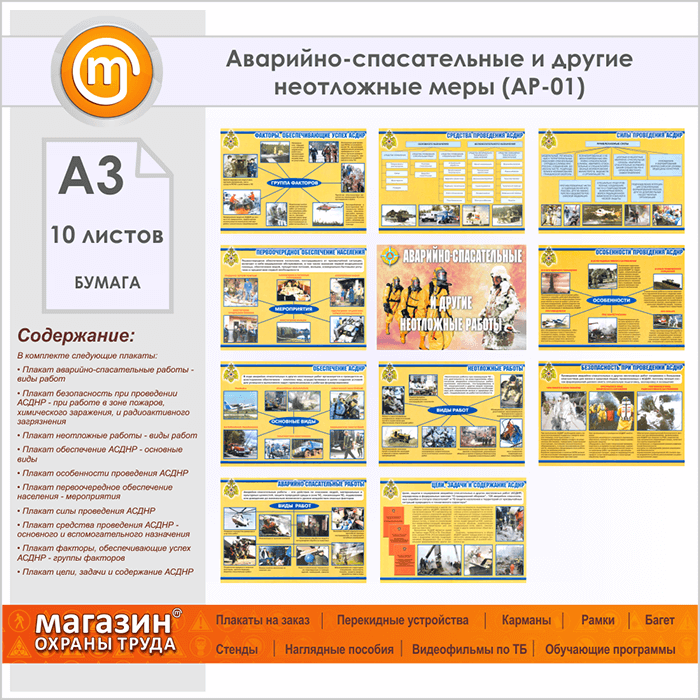 Плакаты «Аварийно-спасательные и другие неотложные меры» (АР-01, бумага, А3, 10 листов) в Омске купить