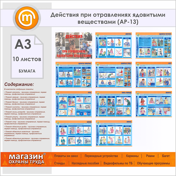 Плакаты «Действия при отравлениях ядовитыми веществами» (АР-13, бумага, А3, 10 листов) в Омске купить