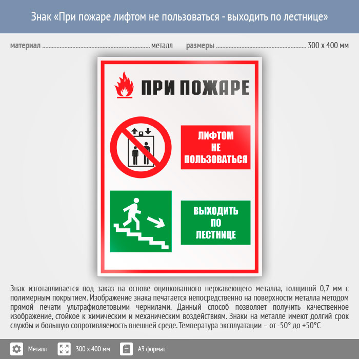 Знак «При пожаре лифтом не пользоваться - выходить по лестнице», КЗ-73 (металл, 300х400 мм) в Омске купить