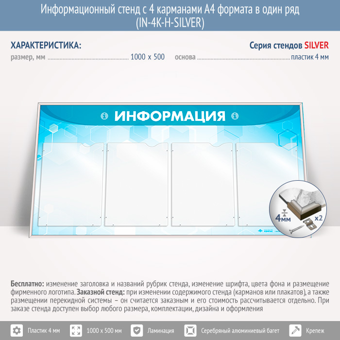 Информационный стенд с 4 карманами А4 формата в один ряд (IN-4K-H-SILVER) в Омске купить