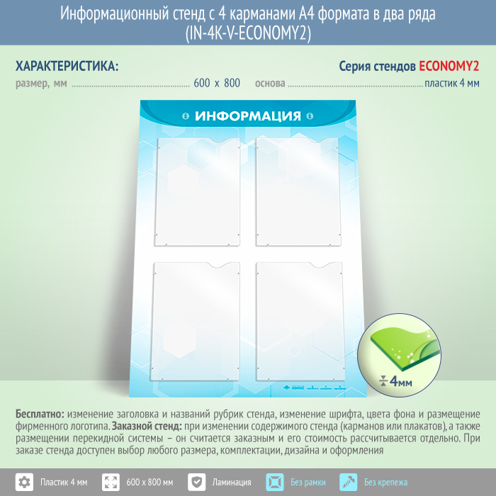 Информационный стенд с 4 карманами А4 формата в два ряда (IN-4K-V-ECONOMY2) в Омске купить