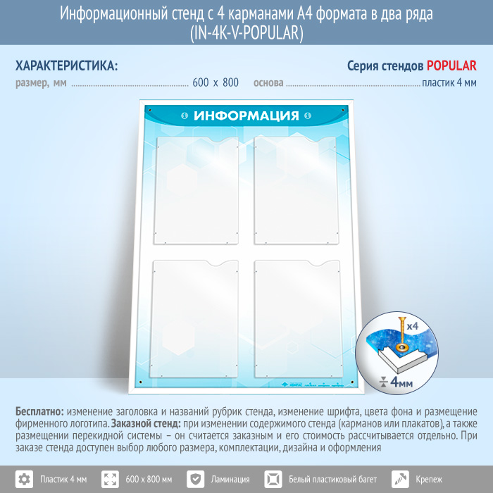 Информационный стенд с 4 карманами А4 формата в два ряда (IN-4K-V-POPULAR) в Омске купить