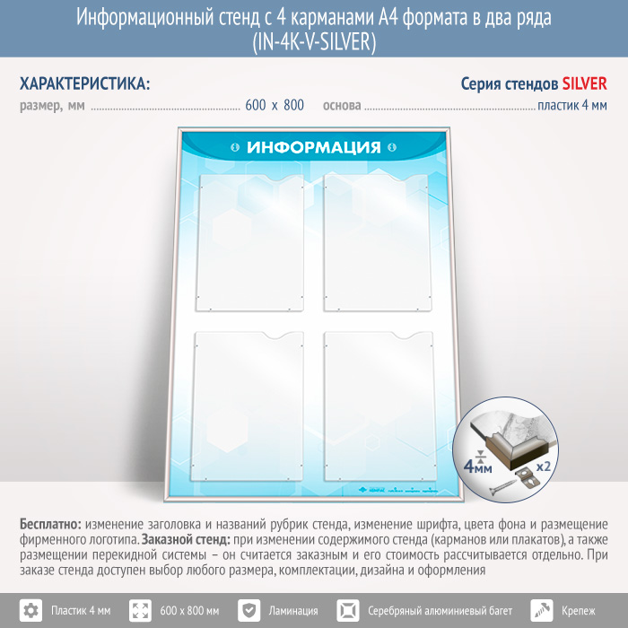 Информационный стенд с 4 карманами А4 формата в два ряда (IN-4K-V-SILVER) в Омске купить