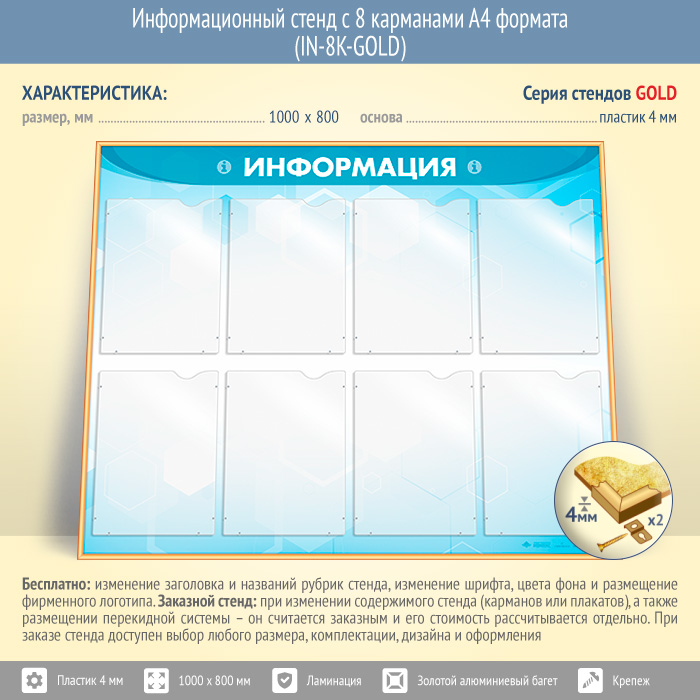 Информационный стенд с 8 карманами А4 формата (IN-8K-GOLD) в Омске купить