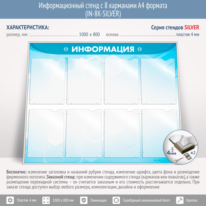 Информационный стенд с 8 карманами А4 формата (IN-8K-SILVER) в Омске купить
