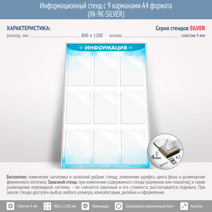 Информационный стенд с 9 карманами А4 формата (IN-9K-SILVER) в Омске купить