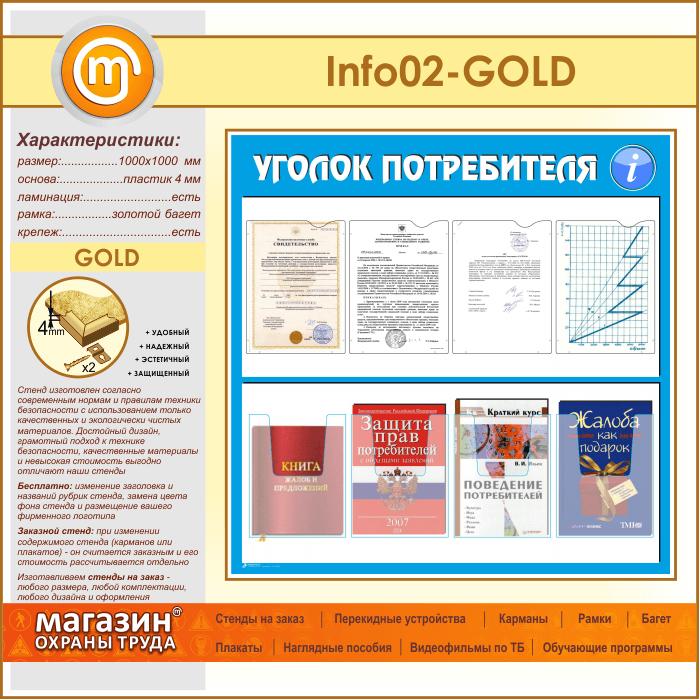 Стенд «Уголок потребителя» с 4 плоскими и 4 объемными карманами А4 формата (IN-02-GOLD) в Омске купить