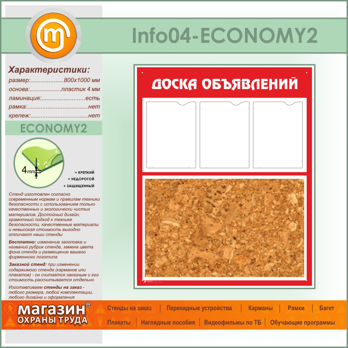 Стенд «Доска объявлений» с пробковым полотном и 3 карманами А4 формата (IN-04-ECONOMY2) в Омске купить