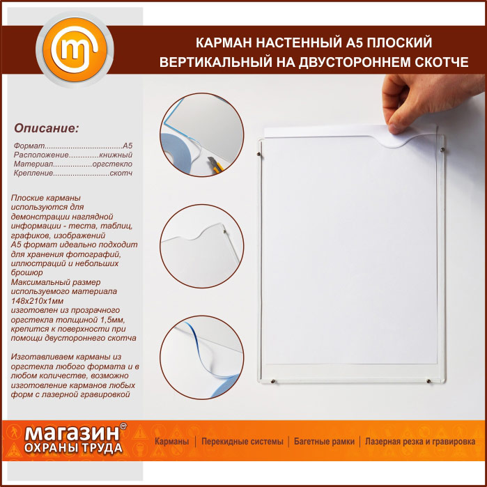 Карман настенный А5 плоский горизонтальный на двустороннем скотче в Омске купить