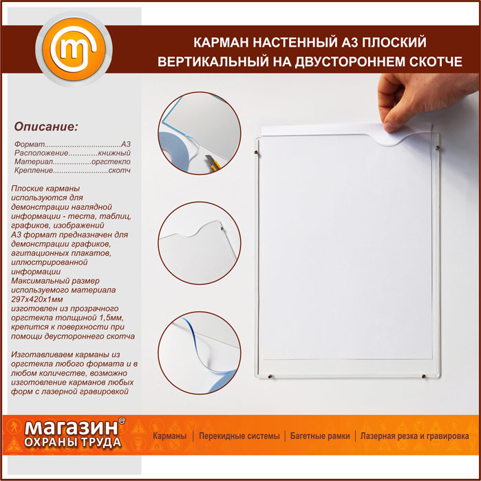 Карман настенный А3 плоский вертикальный на двустороннем скотче в Омске купить