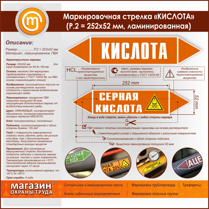 Маркировочная стрелка «КИСЛОТА» (P.2 = 252х52 мм, самоклеящаяся плёнка с ламинированием) в Омске купить