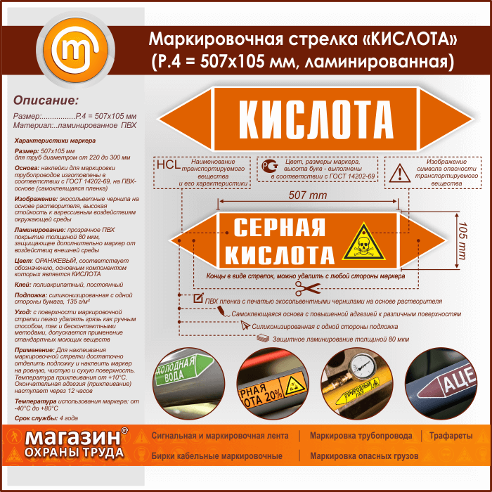 Маркировочная стрелка «КИСЛОТА» (P.4 = 507х105 мм, самоклеящаяся плёнка с ламинированием) в Омске купить