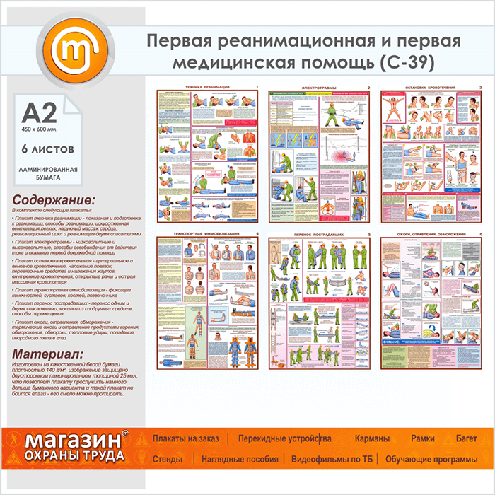 Плакат «Оказание первой помощи пострадавшим» (С-39, ламинированная бумага, А2, 6 листов) в Омске купить