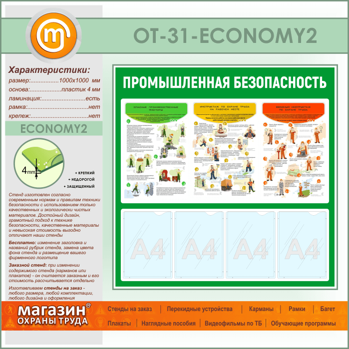 Стенд «Промышленная безопасность» с 4 карманами (OT-31-ECONOMY2) в Омске купить