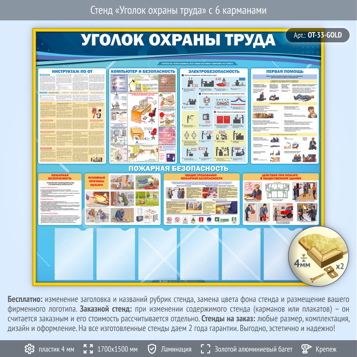 Стенд «Уголок охраны труда» с 6 карманами (OT-33-GOLD) в Омске купить