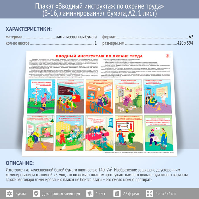Плакат «Вводный инструктаж по охране труда» (В-16, ламинированная бумага, А2, 1 лист) в Омске купить