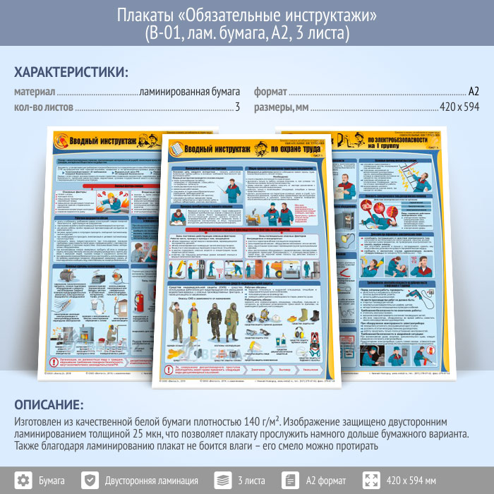 Плакаты «Обязательные инструктажи» (вводный инструктаж, вводный противопожарный инструктаж, инструктаж на I группу по электробезопасности) (В-01, ламинированная бумага, А2, 3 листа) в Омске купить