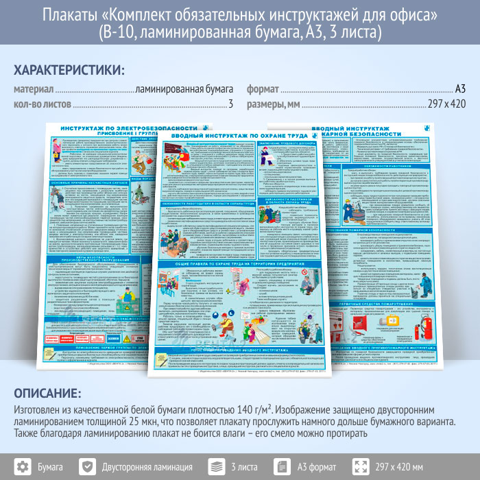 Плакаты «Комплект обязательных инструктажей для офиса» (В-10, ламинированная бумага, А3, 3 листа) в Омске купить